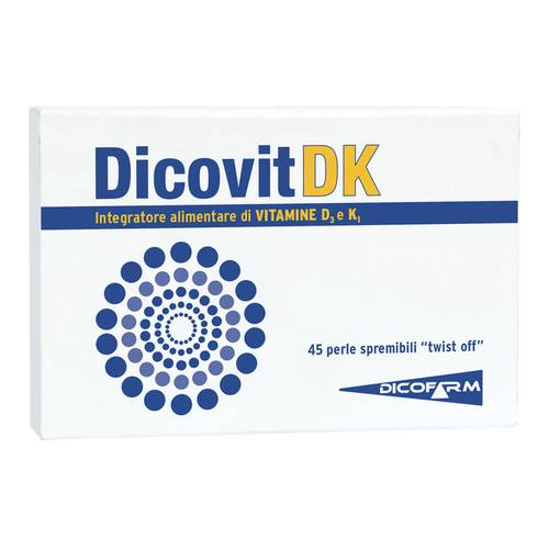 DICOVIT DKDescrizione Integratore alimentare di Vitamina D3 e Vitamina K1 indicato in caso di aumentato fabbisogno di tali nutrienti. La vitamina D e la vitamina K contribuiscono al mantenimento di ossa normali. Inoltre, la vitamina D favorisce la normale funzione del sistema immunitario e la vitamina K contribuisce alla normale coagulazione del sangue. Ingredienti Involucro: gelatina alimentare, umidificante: glicerolo. Contenuto: olio MCT (trigliceridi a media catena da palma e cocco), antiossidante: alfa-tocoferolo, vitamina K1 (fillochinone), vitamina D3 (colecalciferolo). Senza glutine. Caratteristiche nutrizionali Conte...